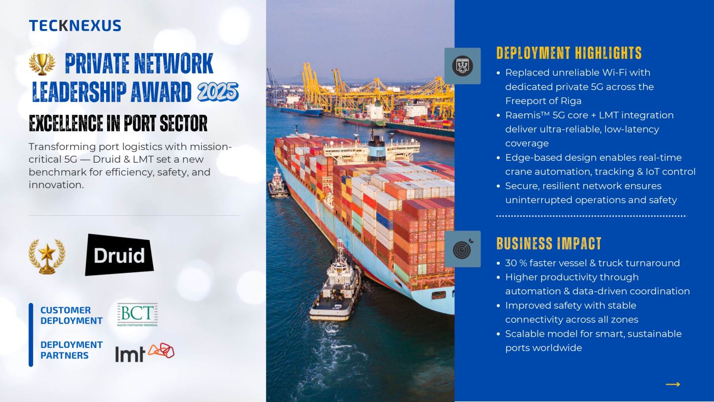 Leveraging Druid’s field-proven Raemis core platform and LMT’s integration expertise, the partners successfully completed a groundbreaking private 5G deployment. This achievement is actively transforming port operations, demonstrating the power of private networks to drive operational excellence and unlock innovation within a demanding industrial environment.